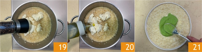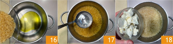 En una olla calienta una cucharada de aceite, añade el arroz 16 y tuesta removiendo a menudo. Moja con agua caliente o caldo vegetal caliente 17 hasta cubrirlo. Lleva el arroz a cocción añadiendo más líquido si es necesario. Cuando el arroz esté cocido, apaga el fuego y añade el stracchino 18.