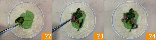 Ajusta de sal y pimienta 19, vierte un hilo de aceite 20 y mezcla. Emplatar el arroz y poner en el centro una cucharada de crema de brócoli 21.