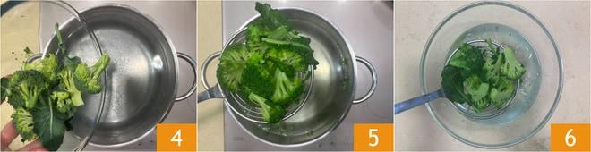 Escaldar por 4 minutos 4, escurrir 5 y enfriar en un bol con agua y hielo 6, escurrir nuevamente y reservar.
