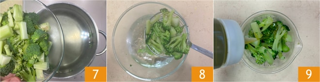 Mientras tanto, divide el resto de los brócoli en floretes; luego pela el tallo y córtalo en trozos. Escalda por 10 minutos también la parte restante de los brócoli 7 y enfríalos en agua y hielo. Escurrir 8, transferir todo a un recipiente alto y condimentar con aceite 9.