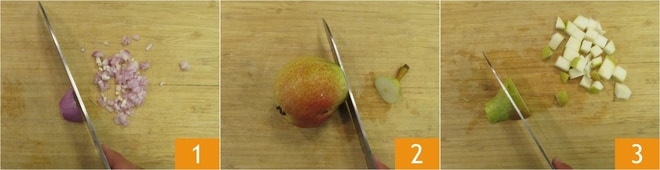 Para preparar el risotto con stracchino, peras y avellanas, limpia y corta la chalota. Lava las peras, elimina el cabito 2, luego córtalas por la mitad, quita el corazón y, sin pelarlas, córtalas en cubos de aproximadamente 1 cm 3.