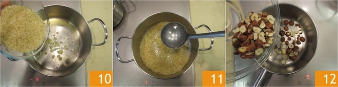 Añade el arroz 10 y tuéstalo hasta que quede transparente, durante unos 2 minutos. Luego agrega poco a poco el agua hirviendo, un cucharón a la vez, cocinando durante 10 minutos 11. Mientras tanto, aparte, tuesta las avellanas en una sartén pequeña 12.