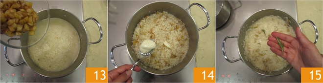 Pasados los 10 minutos de cocción, añade las peras al arroz 13 y continúa cocinando durante otros 8 minutos. Al final de la cocción, apaga el fuego, mezcla con el stracchino 14 y perfuma con el romero 15.