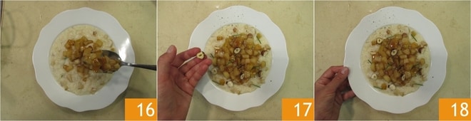 Sirve el arroz con las peras restantes 16, las avellanas tostadas 17 y pimienta al gusto. El risotto con peras, stracchino y avellanas está listo para servirse 18.
