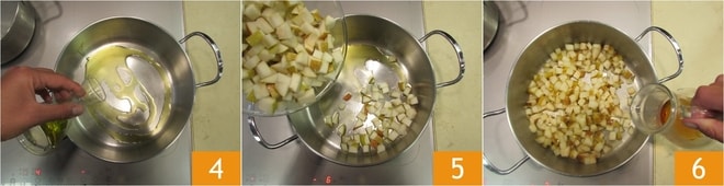Calienta en una cazuela un poco de aceite 4, añade las peras 5 y cocínalas durante 2 minutos a fuego vivo. Rocía las peras con el ron 6.