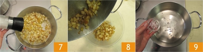 Sala 7, cocina durante otros 3 minutos y reserva 8. En la misma cazuela dora la chalota picada 9.