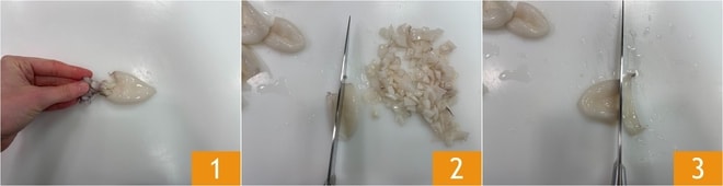 Para preparar el risotto con tinta de sepia, primero asegúrate de que el caldo de pescado esté caliente y que las sepias estén bien limpias. Separa los tentáculos del manto 1 y corta aproximadamente la mitad en trozos 2 y la otra mitad en tiras finas 3.