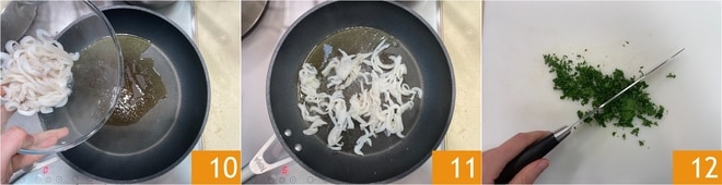 Mientras tanto, en una sartén caliente, añade un hilo de aceite y las tiras de sepia 10. Saltéalas durante 4-5 minutos hasta que estén bien doradas 11. Pica también el perejil.