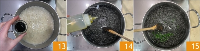 Cuando el arroz esté casi cocido, aproximadamente 2 minutos antes, añade la tinta de sepia 13; mezcla bien y ajusta de sal si es necesario. Añade un hilo de aceite para emulsionar el risotto 14 y sazona con buena parte del perejil picado 15.
