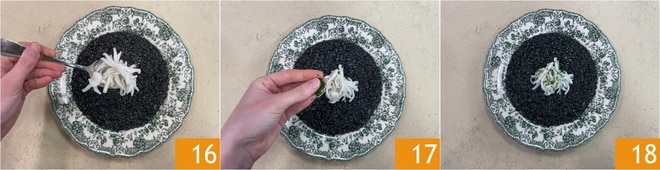 Emplata y coloca en el centro las tiras de sepia 16. Decora con el perejil picado 17, añade un hilo de aceite en crudo y sirve bien caliente el risotto con tinta de sepia 18.