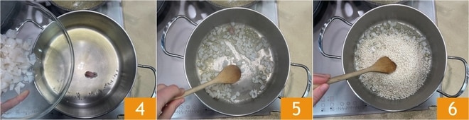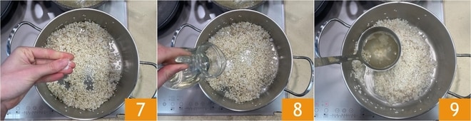 Añade una pizca de sal 7 y desglasa con el vino blanco 8. Cuando el alcohol se haya evaporado por completo, lleva el arroz a cocción añadiendo el caldo de pescado caliente 9. Asegúrate de que el arroz esté siempre cubierto, pero no te excedas con el caldo.
