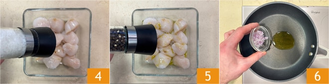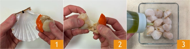Para preparar el risotto con vieiras y cítricos, lo primero que debes hacer es liberar el fruto de la concha 1, separar el coral de la nuez 2 y reservar. Pon las nueces en un bol y sazona con aceite 3.