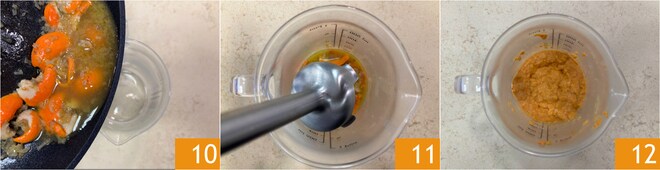 Transfiere todo a un vaso 10 y tritura con una batidora de mano 11 hasta obtener una crema lisa y homogénea 12.