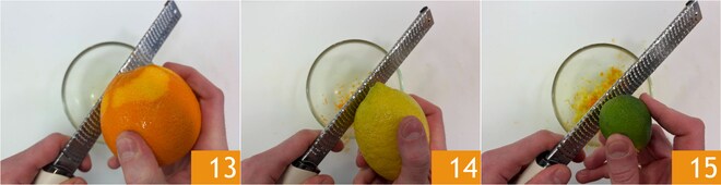 Ralla la cáscara de la naranja 13, del limón 14 y del lima 15.