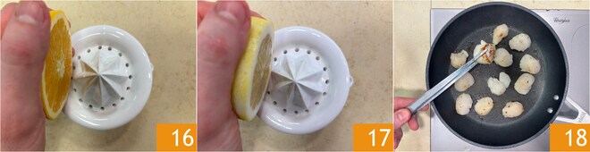 Extrae el jugo de la naranja 16 y del limón 17. Calienta bien una sartén antiadherente y cocina las vieiras 30 segundos por lado 18.