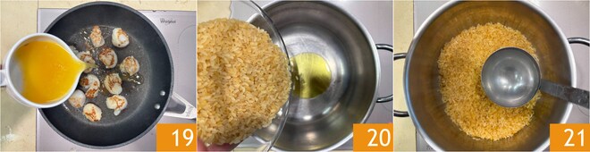 Desglasa con jugo de naranja y limón 19. Reserva tanto las vieiras como el fondo de cocción. En una olla pon un chorro de aceite, añade el arroz 20 y tuesta durante unos minutos. Desglasa con prosecco y cuando toda la parte alcohólica se haya evaporado, moja con agua ligeramente salada 21 o con caldo de pescado. Vierte un cucharón de agua cada vez que la anterior haya sido absorbida por el arroz y lleva a cocción.