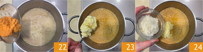 Cuando falten 5 minutos para el final de la cocción, añade la crema de coral 22. Una vez terminada la cocción del arroz, apaga el fuego, añade la mantequilla 23 y el Parmigiano 24.