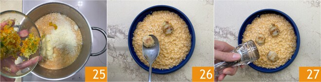 Agrega también las cáscaras de los cítricos 25 y manteca. Emplata, coloca sobre la superficie del risotto las vieiras 26 y añade una pizca de pimienta negra 27.