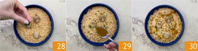 Completa con cebollino recién picado 28 y el fondo de cocción de las vieiras 29. ¡El risotto con vieiras y cítricos está listo para ser servido 30!