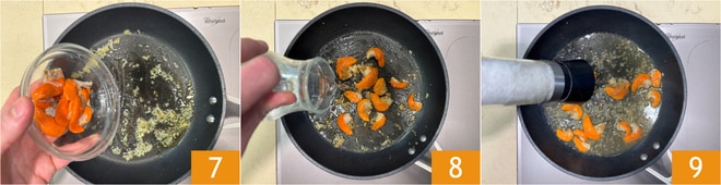 Agrega los corales 7, moja con un vaso de agua 8 y cocina por un minuto. Ajusta de sal 9.