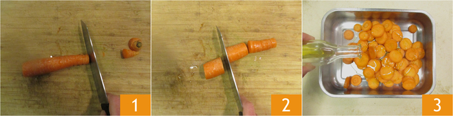 Para preparar el risotto con zanahorias y salchicha lavad las zanahorias, cortad las puntas 1 y cortadlas en rodajas de ½ cm de grosor 2. Poned las zanahorias en una bandeja y sazonad con un chorrito de aceite 3,