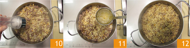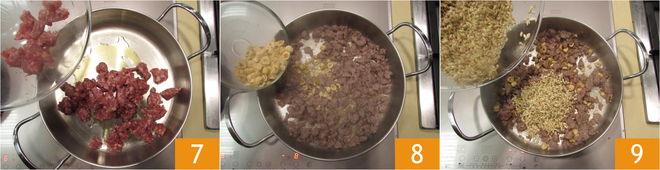 añadid la salchicha 7 y dorad a fuego vivo durante unos 3 minutos. Añadid también 80 g de avellanas peladas 8 y el arroz integral en la cazuela 9, tostadlo durante un par de minutos con los otros ingredientes.