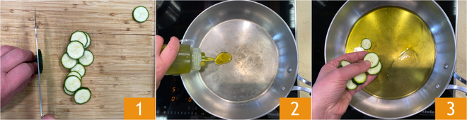 Para preparar el risotto de calabacín y salchicha, lo primero es quitar las puntas a los calabacines y cortarlos en rodajas finas 1. Vierte abundante aceite de oliva en una sartén 2 y, cuando esté bien caliente, añade un tercio de los calabacines 3.