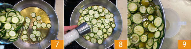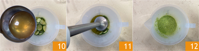 En la misma sartén, añade los calabacines restantes 7, sala 8 y cocínalos a fuego medio durante unos 10 minutos. Cuando estén tiernos, pásalos a un vaso batidor 9.