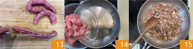 Pasamos a la salchicha: haz un corte 13 y quita la tripa. Calienta la sartén en la que has cocinado los calabacines, añade la salchicha 14 y dóralas a fuego medio durante unos minutos, desmenuzándola con una cuchara de madera 15. Cuando esté cocinada y dorada, retírala del fuego y reserva.