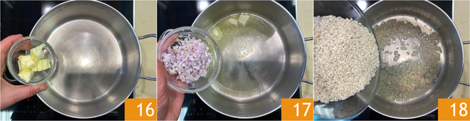 Ahora dedícate al risotto: funde la mantequilla en una cacerola 16, luego añade la chalota finamente picada 17 y deja que se poche a fuego suave durante un par de minutos. Cuando esté translúcida, incorpora el arroz 18 y una pizca de sal.