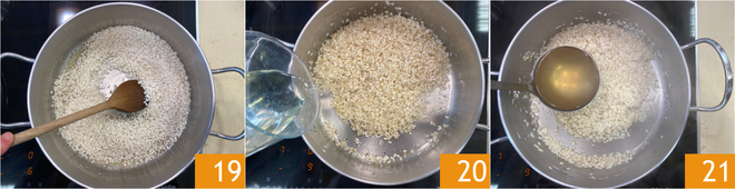 Tuesta el arroz durante 1-2 minutos, removiendo a menudo 19. Añade el vino blanco 20 y deja evaporar completamente el alcohol, luego cocina el arroz añadiendo un cucharón de caldo caliente a la vez, asegurándote de que el líquido se haya absorbido antes de añadir más 21.