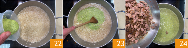 Tras unos 10 minutos, añade aproximadamente dos tercios de la crema de calabacín 22 y mezcla para condimentar uniformemente el arroz 23. Incorpora también la salchicha dorada 24 y termina de cocinar el risotto; tardará unos 5 minutos más.