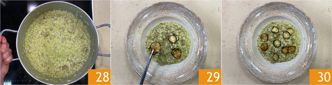 Una vez listo, apaga el fuego y manteca con el Parmigiano Reggiano rallado 25, la mantequilla fría 26 y la crema de calabacín restante 27.