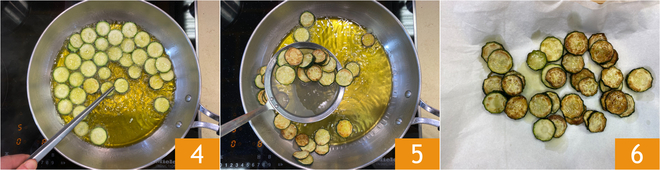 Fríe las rodajas dándoles la vuelta por ambos lados 4. Una vez doradas, escúrrelas 5 y pásalas a papel absorbente 6. Reserva.