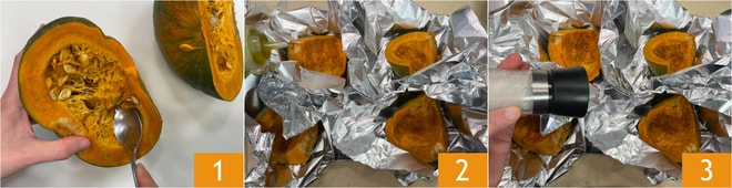 Para preparar el risotto de calabaza y setas, lo primero que tenéis que hacer es cortar la calabaza y eliminar las semillas y los filamentos internos 1. Divididla en 4 trozos y poned cada uno de ellos sobre una hoja de papel de aluminio, aderezad con aceite 2, sal y pimienta 3.