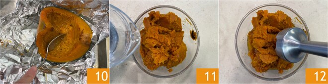 Extraed la pulpa de la calabaza con una cuchara 10 y transferidla a un bol. Añadid un poco de agua 11 y batid, con una batidora de mano 12 hasta obtener un puré homogéneo. Reservad.