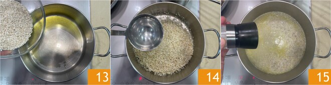 En una olla calentad el aceite, añadid el arroz 13 y dejad tostar durante unos minutos. Mojad con agua 14, ajustad de sal 15 y continuad cocinando, añadiendo un cucharón de agua cada vez que el arroz absorba el anterior.