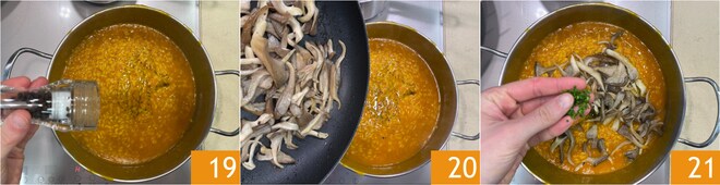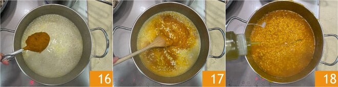 Una vez llegados a la mitad de la cocción, añadid el puré de calabaza 16, mezclad 17 y completad la cocción. Al final añadid el aceite 18.