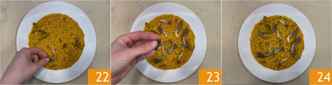 Emplatad, colocad sobre la superficie del arroz las setas 22 y completad con el cebollino 23. Vuestro risotto de calabaza y setas está listo para ser disfrutado 24.