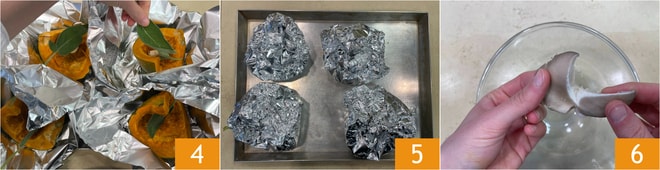 Añadid, para cada trozo, el ajo sin pelar y la salvia 4. Cerrad las hojas de papel de aluminio 5 y hornead en horno estático, precalentado, a 230°C durante 1 hora. Mientras tanto, romped con las manos las setas pleurotus limpias 6.