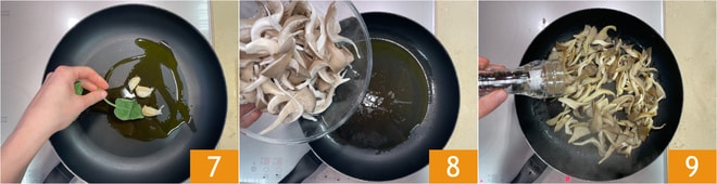 En una sartén verted un chorrito de aceite, añadid el ajo sin pelar y la salvia 7 y rehogad a fuego lento. Agregad las setas 8, subid el fuego, y doradlas durante unos minutos. Ajustad de sal y pimienta 9.