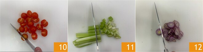 Divida los tomatitos por la mitad 10, luego corte en trozos el tallo de apio 11 y las chalotas 12.