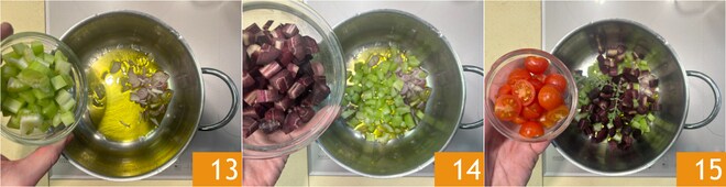 Comience a ocuparse del caldo: en una olla con un chorrito de aceite, vierta las chalotas y el apio 13. Agregue las zanahorias 14, las ramitas de mejorana y los tomatitos 15. Tueste durante unos minutos.