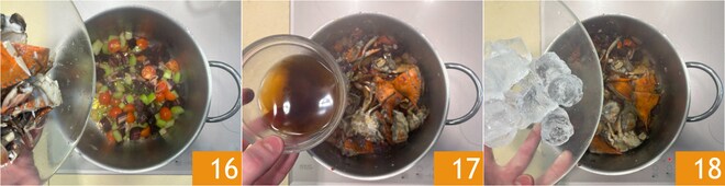 Luego agregue los caparazones de los cangrejos 16 y dore durante unos minutos a fuego medio. Desglase con el ron 17 y, cuando toda la parte alcohólica se haya evaporado, agregue el hielo 18.
