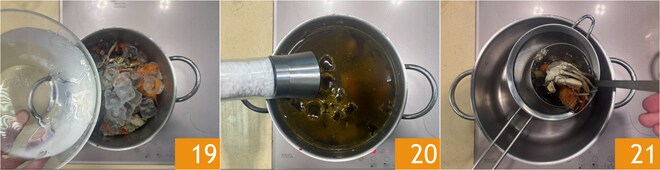 Cubra con agua fría 19, luego ajuste de sal y pimienta 20. Cocine durante 30 minutos o hasta que el líquido se haya reducido a la mitad. Cuele el caldo 21 y manténgalo caliente.