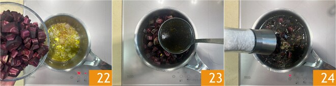 Pase a la crema de zanahorias moradas: en una olla, vierta un chorrito de aceite, agregue la chalota restante y deje sofreír. Agregue las zanahorias 22, moje con el caldo de cangrejo 23, salpimiente 24. Cocine hasta que las zanahorias estén blandas.