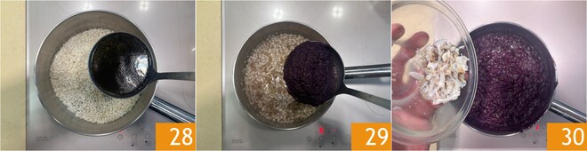 Ahora puede comenzar a cocinar el risotto: en una olla ponga el arroz, añada una pizca de sal y tuéstelo en seco durante unos minutos. Moje con el caldo de cangrejo 28 y cocine el arroz de esta manera, añadiendo un cucharón a la vez, apenas el líquido se haya absorbido. Cuando falten 2 minutos para el final de la cocción, agregue la crema de zanahorias moradas 29. Apague el fuego y mezcle añadiendo la carne de cangrejo 30.