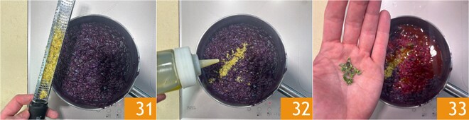 Complete con la ralladura de cáscara de cidra 31, un chorrito de aceite 32 y mejorana 33.