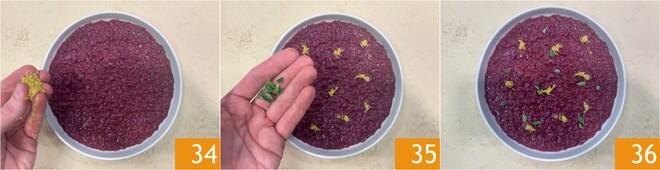 Emplate y complete con más ralladura de cáscara de cidra 34, un chorrito de aceite y algunas hojas de mejorana 35. ¡El risotto de cangrejo azul está listo para ser disfrutado 36!