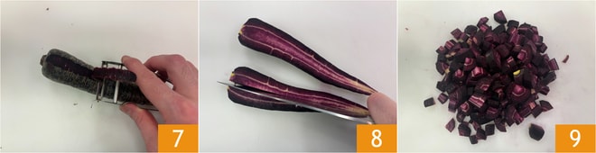 Prepare los ingredientes que necesitará para el caldo y para la crema, manteniéndolos separados: pele las zanahorias moradas 7 y córtelas primero en tiras 8 y luego en trozos 9.